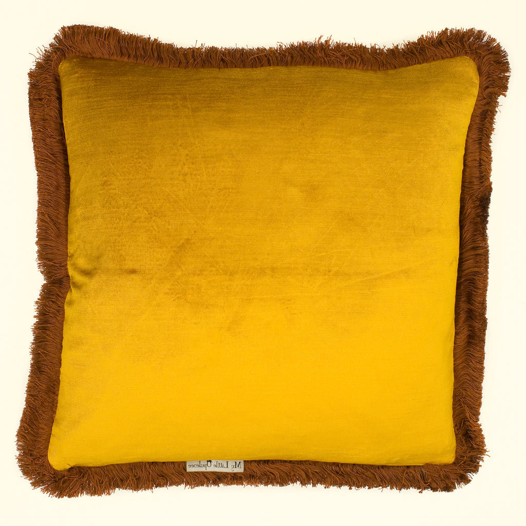Exotic 100% printed linen from England with opulent fringe trim and gold velvet backing